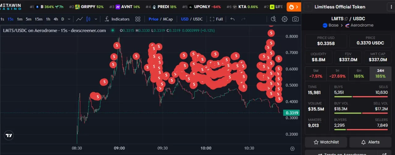 团队关联钱包(0x3c583Be48D2796534f8FC8EA214674Ff055d01d7,初始持有 4000 万枚代币)向一个销售地址(0xBF3132977d9801506deF8E927c4Ff06E5b0801d1)转入 500 万枚 LMTS,并在数小时内全部卖出,累计获利约 230 万美元。