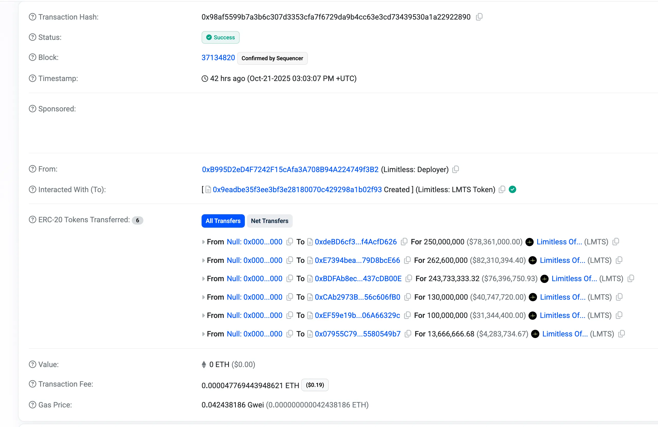 在本次 Limitless 的 TGE 中,团队的说法是采用了这一策略。根据链上数据, LMTS 代币的创建时间距离正式公布仅约 21 小时 。在此期间,项目方完成了代币分发与合约部署,直到确认一切“安全”后,才正式公布合约地址。