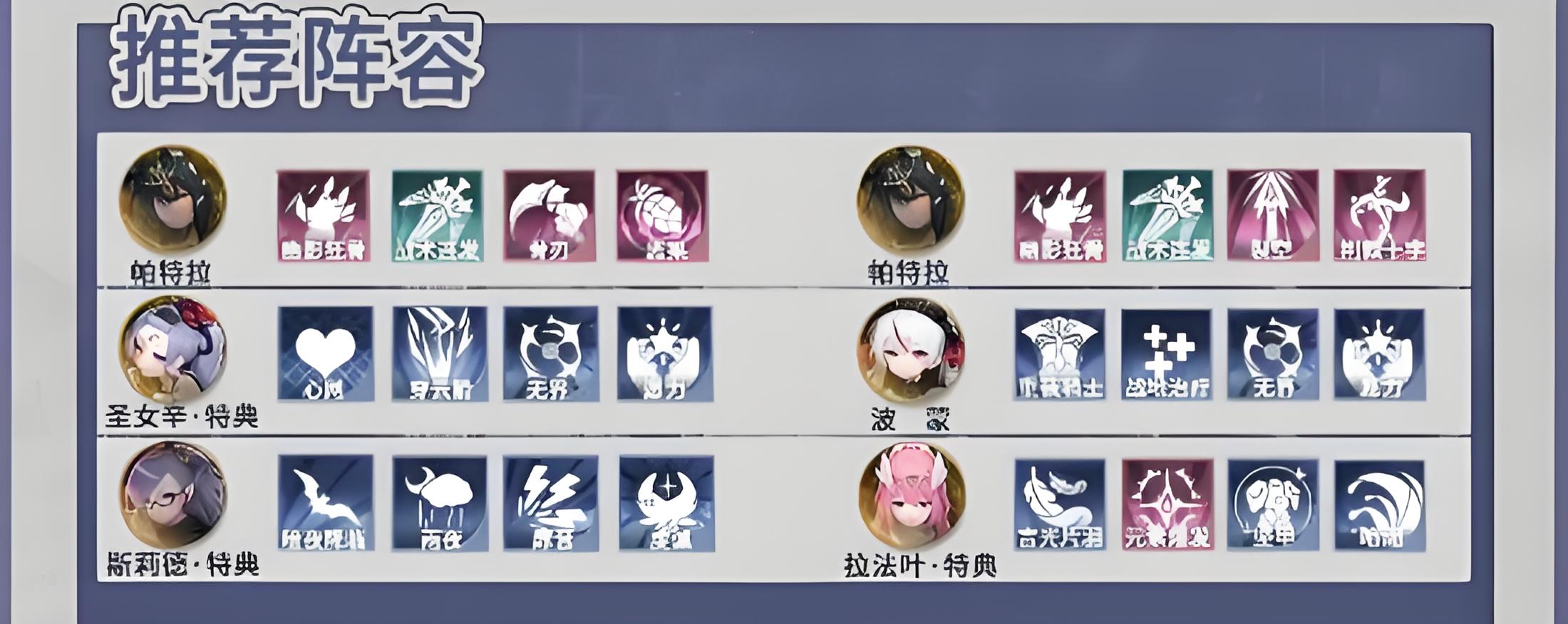5、推荐阵容包含帕特拉搭配圣女辛特典、波蒙等角色,技能搭配有穿云箭、无界、吉光片羽等,可形成不同战术组合,以此强化整体战力。