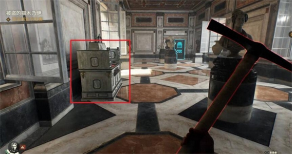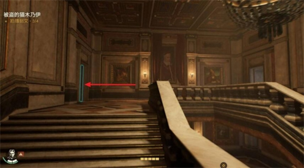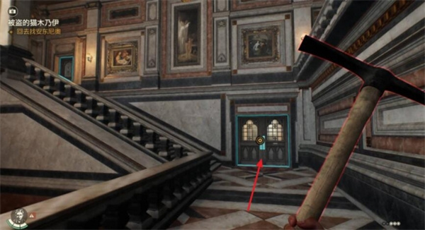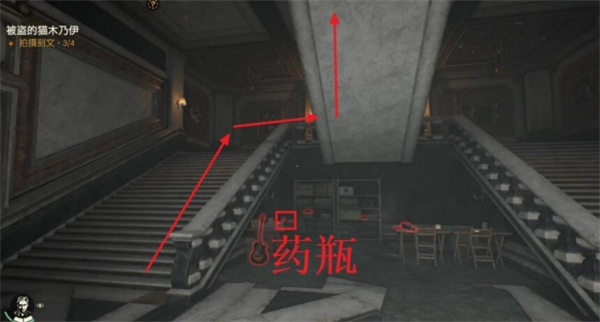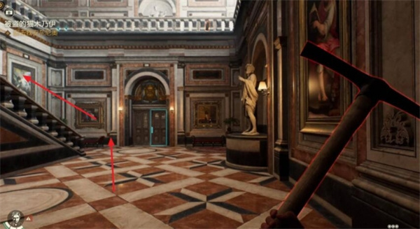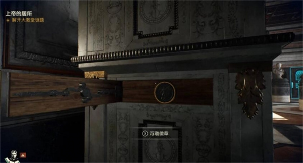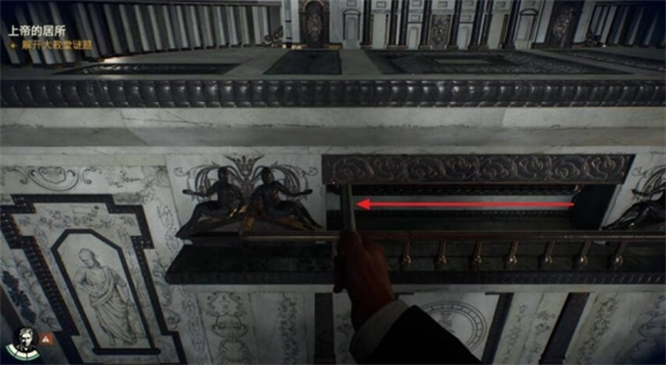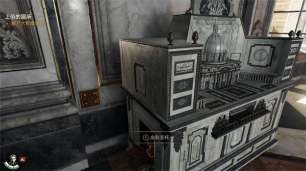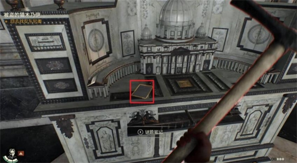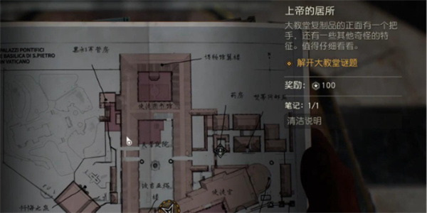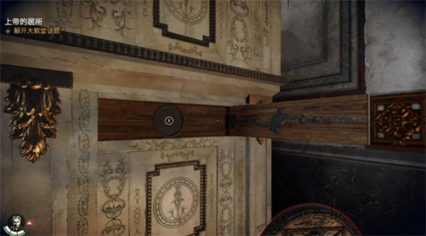 2、继续沿着楼梯走进入图示的房间,拾取左边墙角的谜题笔记【清洁说明】开启谜题【上帝的居所】;