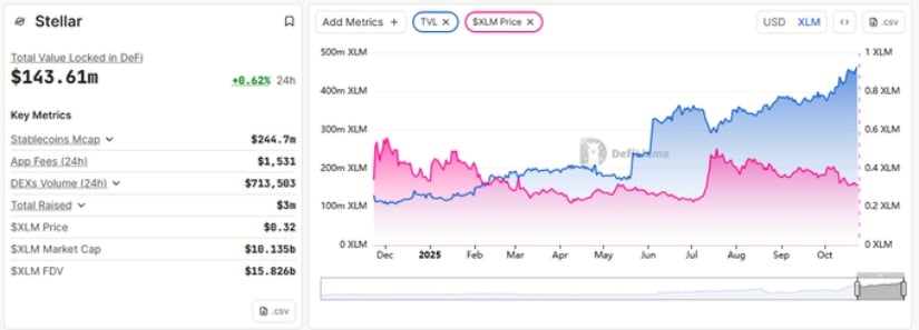 恒星币在DeFi协议中的总锁仓量(TVL)已突破4.56亿枚代币(约合1.436亿美元),创历史新高。这一里程碑达成之际,尽管该代币较2024年12月高点下跌50%,现价仍维持在0.32美元附近。