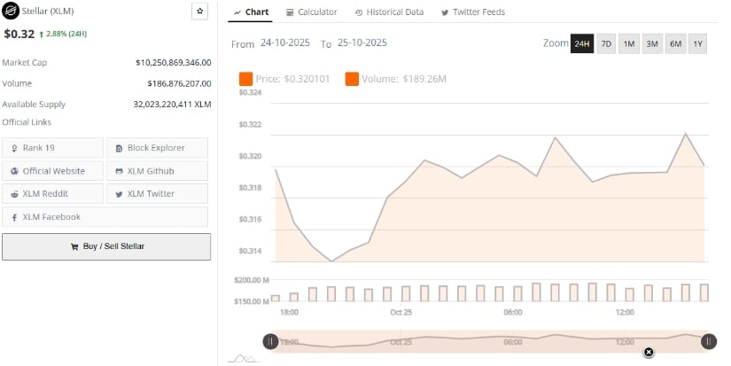 BraveNewCoin数据显示,恒星币现报0.32美元,24小时涨幅2.88%。市值102.5亿美元排名第19位,日交易量1.868亿美元。虽经历市场波动,但自10月低点反弹后展现韧性。
