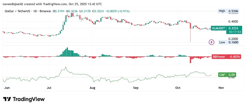 从价格走势看,XLM在2025年7月曾上演从0.2美元飙升至0.52美元的强势牛市,此后进入下降通道,10月下探0.16美元后回升至0.32美元。这种结构显示上涨后的派发阶段,当前或正形成整理区间。
