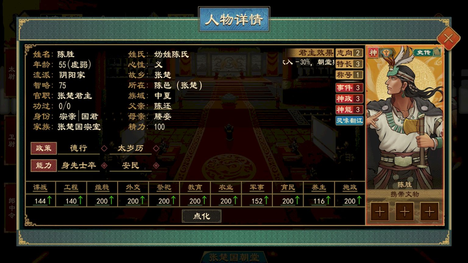5、附带凤鸿之阵百鸟之祖等能力,分别提升全军战力上限与正统,灵石化身事件还能辅助领土扩张与建筑修复。