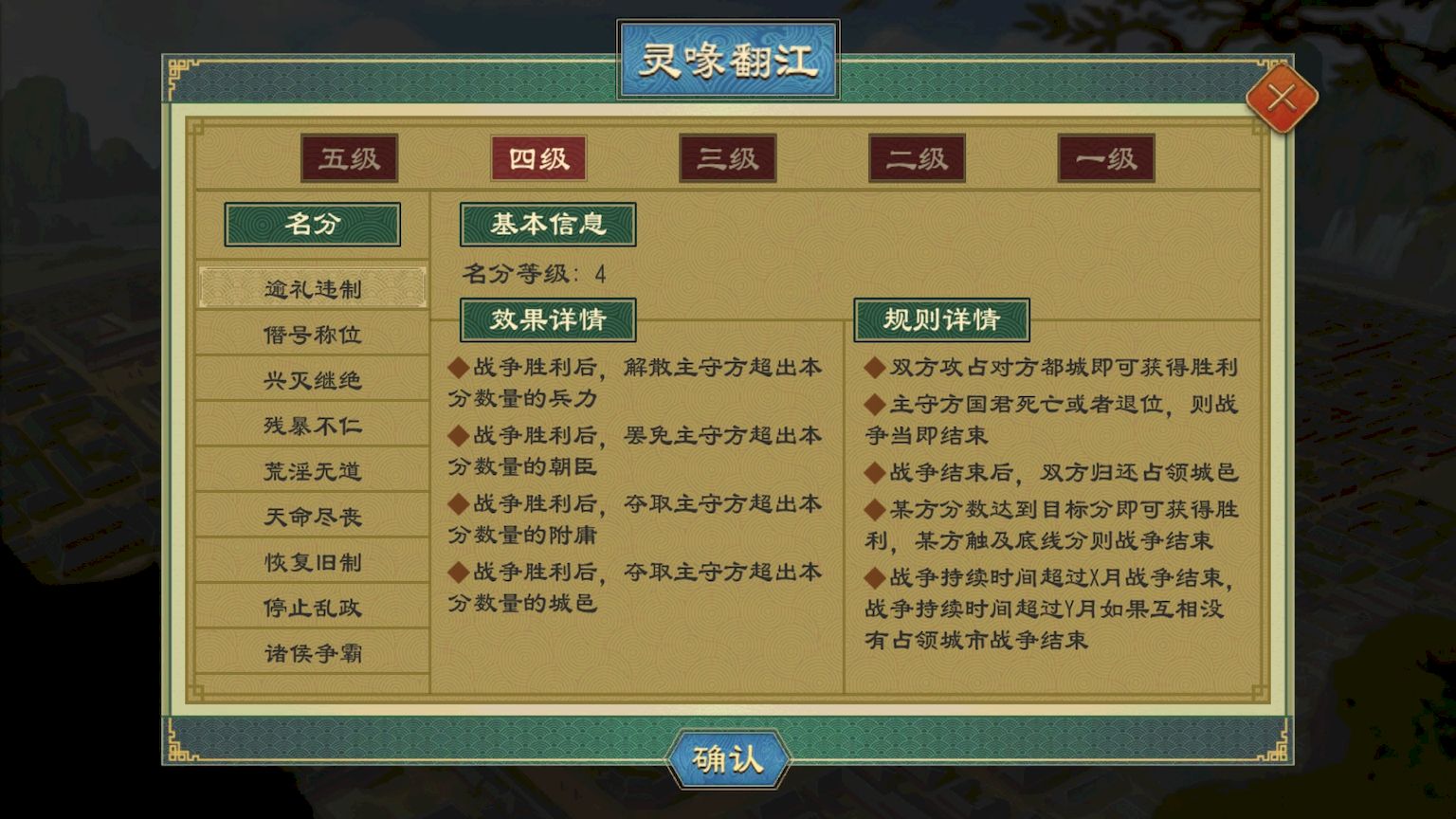 4、无视量级等限制条件,可自由提升或降低战争名分等级,能将低等级名分升级为统一四海以最大化战争收益。
