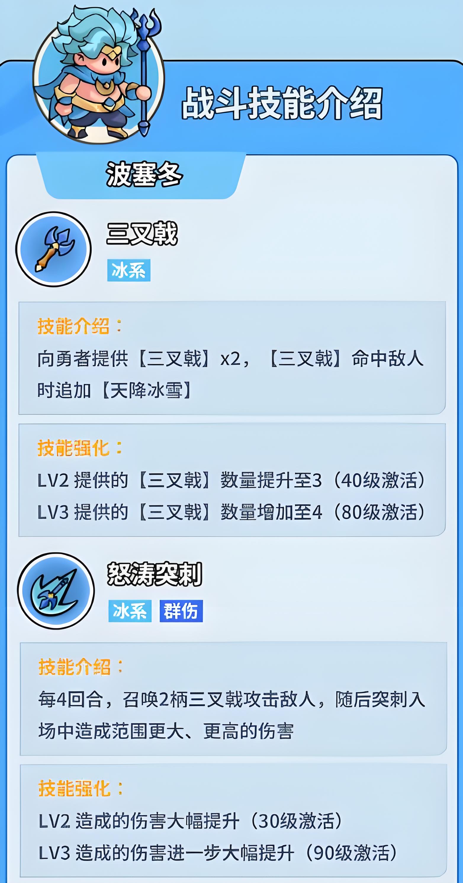 3、怒涛突刺为群伤技能每四回合触发,召唤两柄三叉戟攻击后突刺,30级90级分别解锁伤害强化,70级可减少一回合冷却。