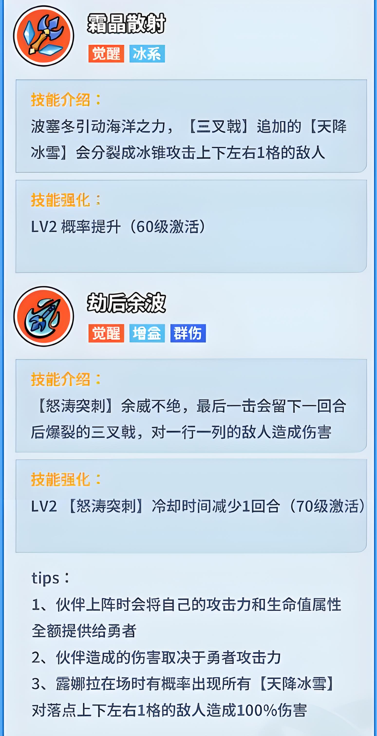 1、角色定位明确,作为冰系伙伴主打范围控制与群体爆发,手持三叉戟掌控怒涛与风暴,能庇护己方也可以巨浪惩戒敌军。