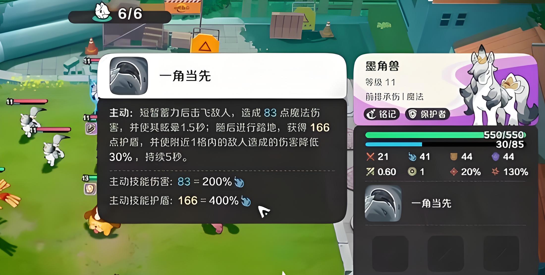 2、核心主动技能一角当先蓄力后击飞敌人并造成83点魔法伤害,附带15秒眩晕后续生成166点护盾,周围1格内友军获百分之三十减伤。