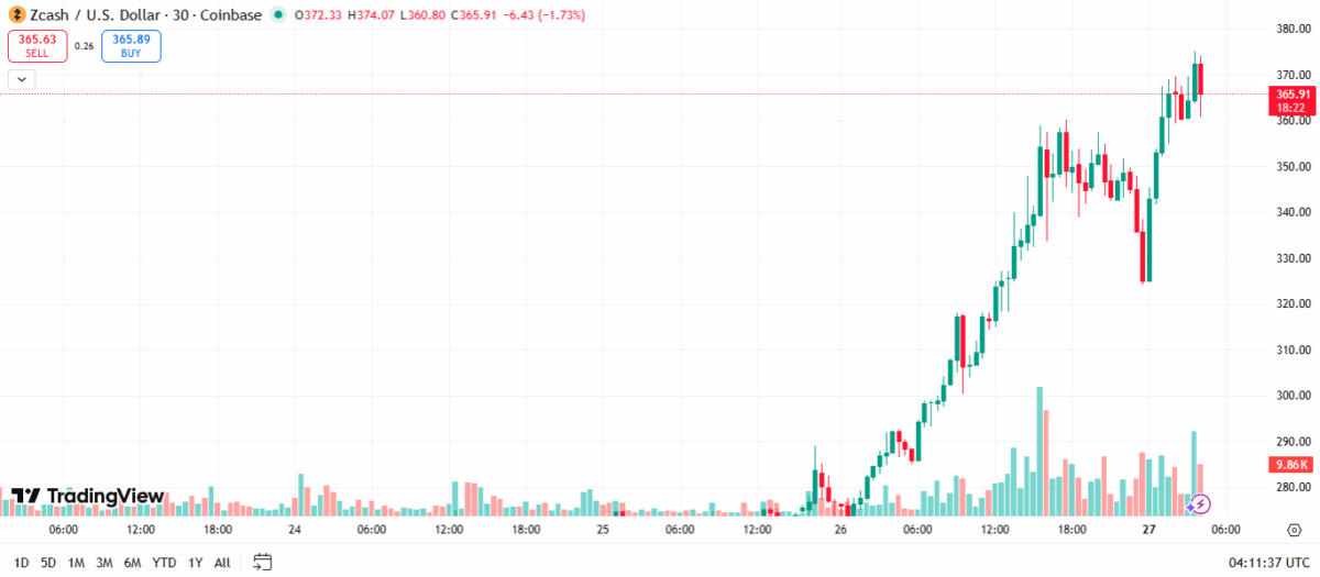 注重隐私的加密货币Zcash(ZEC)在24小时内飙升36%,从272美元攀升至370美元的峰值。此次上涨成为同期市值前25名加密货币中最强劲的行情之一。