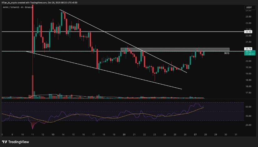 AVAX在四小时图上完成对20-20.50美元区间的重新占领后,正在形成清晰的突破结构(BOS)。该资产已突破下降通道,表明动能开始向买方倾斜。RSI指标同样进入看涨区域,进一步确认力量增强。