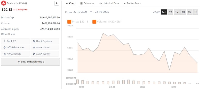 Avalanche当前价格为20.18美元,24小时跌幅2.99%。来源:Brave New Coin