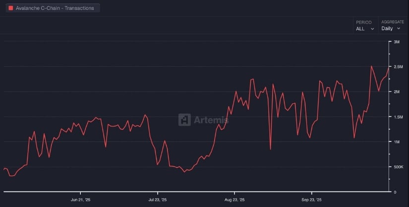 Avalanche C链日交易量同比增长12倍达250万笔,显示DeFi与RWA领域快速增长。来源:Nicolas Lemaitre(X平台)