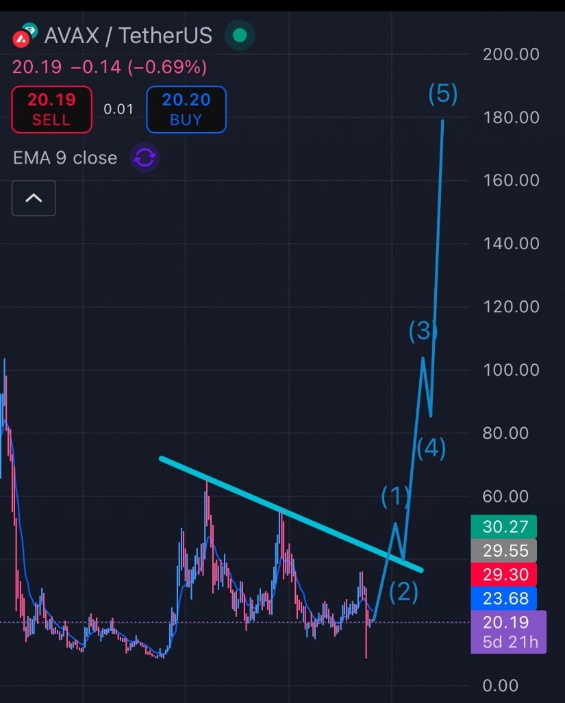 Avalanche艾略特波浪形态预示潜在五浪上涨至300美元,关键突破确认位在30-35美元上方。来源:Maiay(X平台)