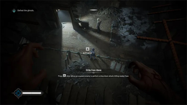 将出现一个教程工具提示,教您如何“从上方打击”。这是一种从上方对敌人进行隐身攻击的方法。这将杀死较弱的敌人,例如这个房间里的食尸鬼。后期的一些更强大的敌人不会那么容易倒下。