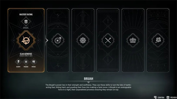在对话的某个时刻,必须选择您属于哪个氏族。有六种不同的选择,每种都有自己的游戏风格和精通等级。精通等级代表游戏的难度。
