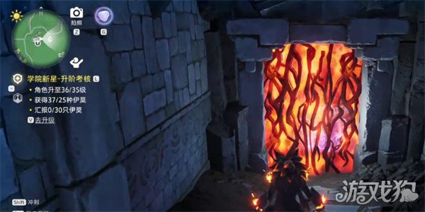 这扇门前面是有很多荆棘给门口挡住的,所以大家在这里直接使用小炭犬的技能效果,燃烧掉这里的荆棘,就可以进入其中,然后有一个能量收集需要大家做完,跟随亮起来的蓝色球型能量体就可以完成能量收集,随后开始探索大家首先遇到的会是碎岩仔,这里大家还可以收集到很多的土灵碎晶,其中有些宝箱的位置比较隐蔽,大家可能需要依靠不同的路线探索才可以进入其中,还有部分宝箱是藏在没有光照的石壁处,此类宝箱周边有一些蓝色的光晕特效会显露,大家可以依靠这些特效来找到宝箱。