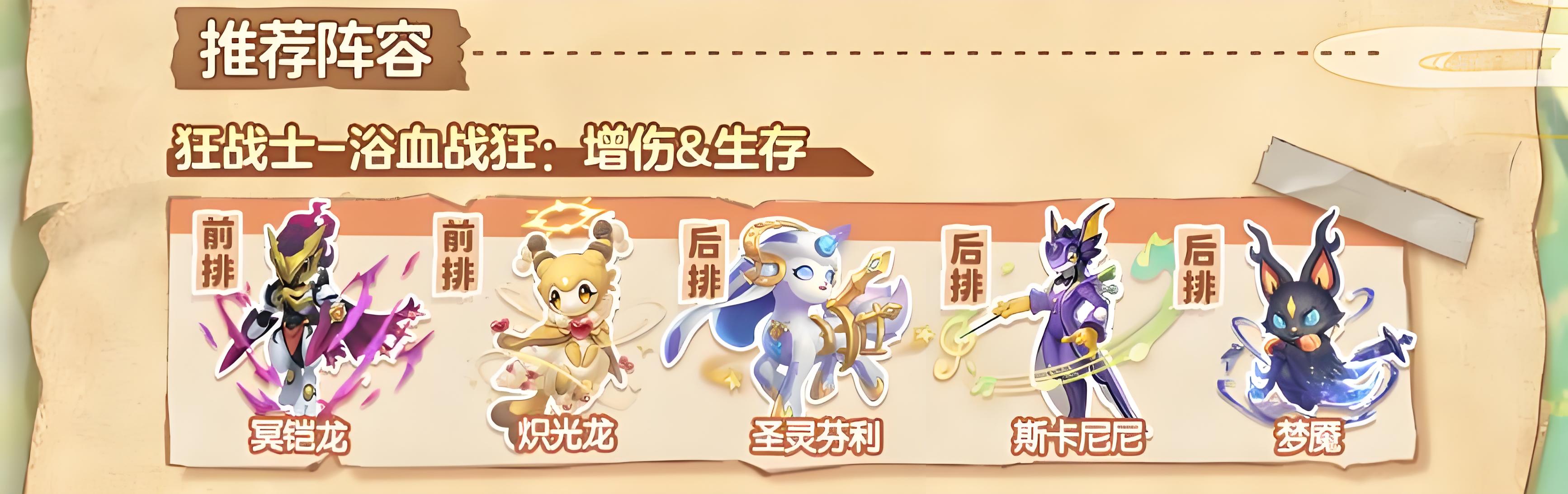 4、推荐增伤生存阵容狂战士浴血战狂组合,包含冥铠龙炽光龙圣灵芬利斯卡尼尼梦魇适配进攻战局。