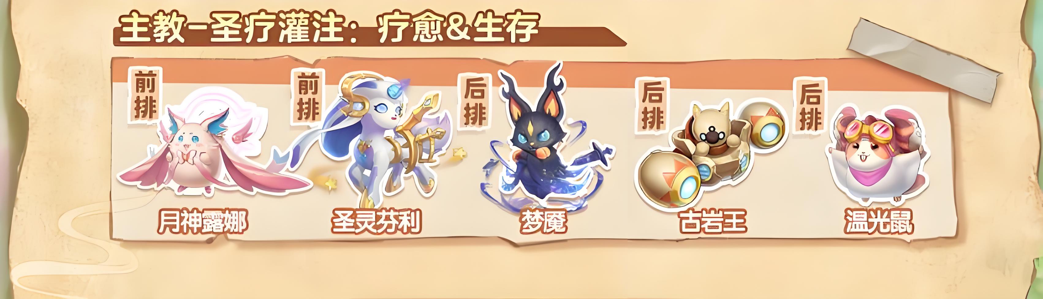 5、疗愈生存阵容主教圣疗灌注组合,由月裨霭娜圣灵芬利梦魇吉王温光鼠组成侧重续航防守。