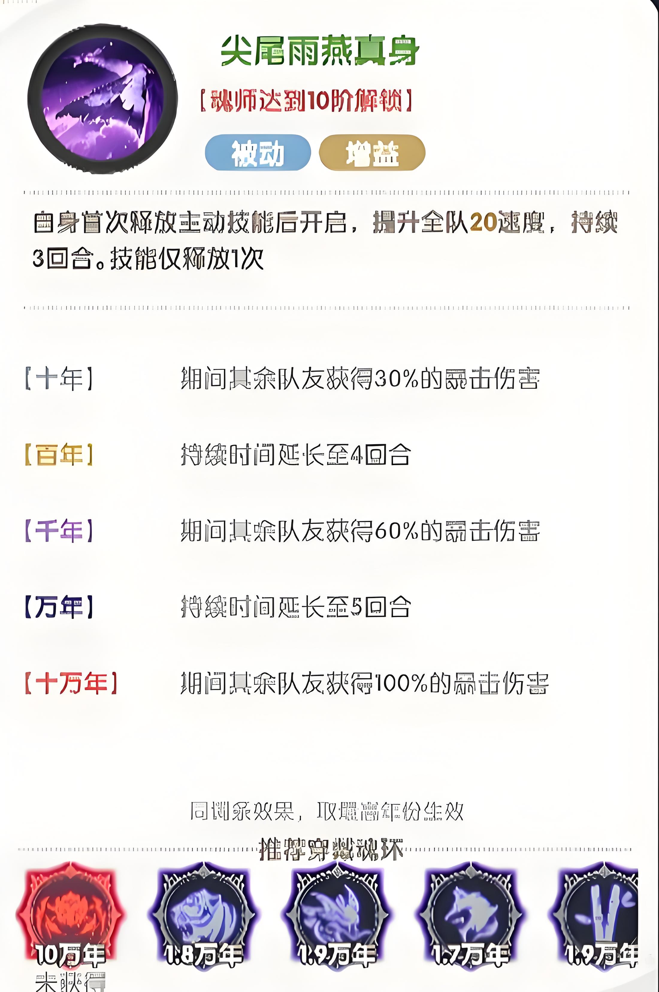 3、独特先发机制战斗前恢复队友魂力并附加伤害加成,搭配踏燕与尖尾雨燕真身,降低敌方暴击抵抗提升己方暴击伤害强化爆发。