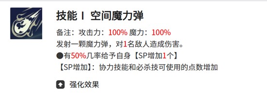 2、主动技能空间魔力弹,对单个敌人造成100%攻击力伤害,50%概率给自己增加1点SP,保障资源续航。