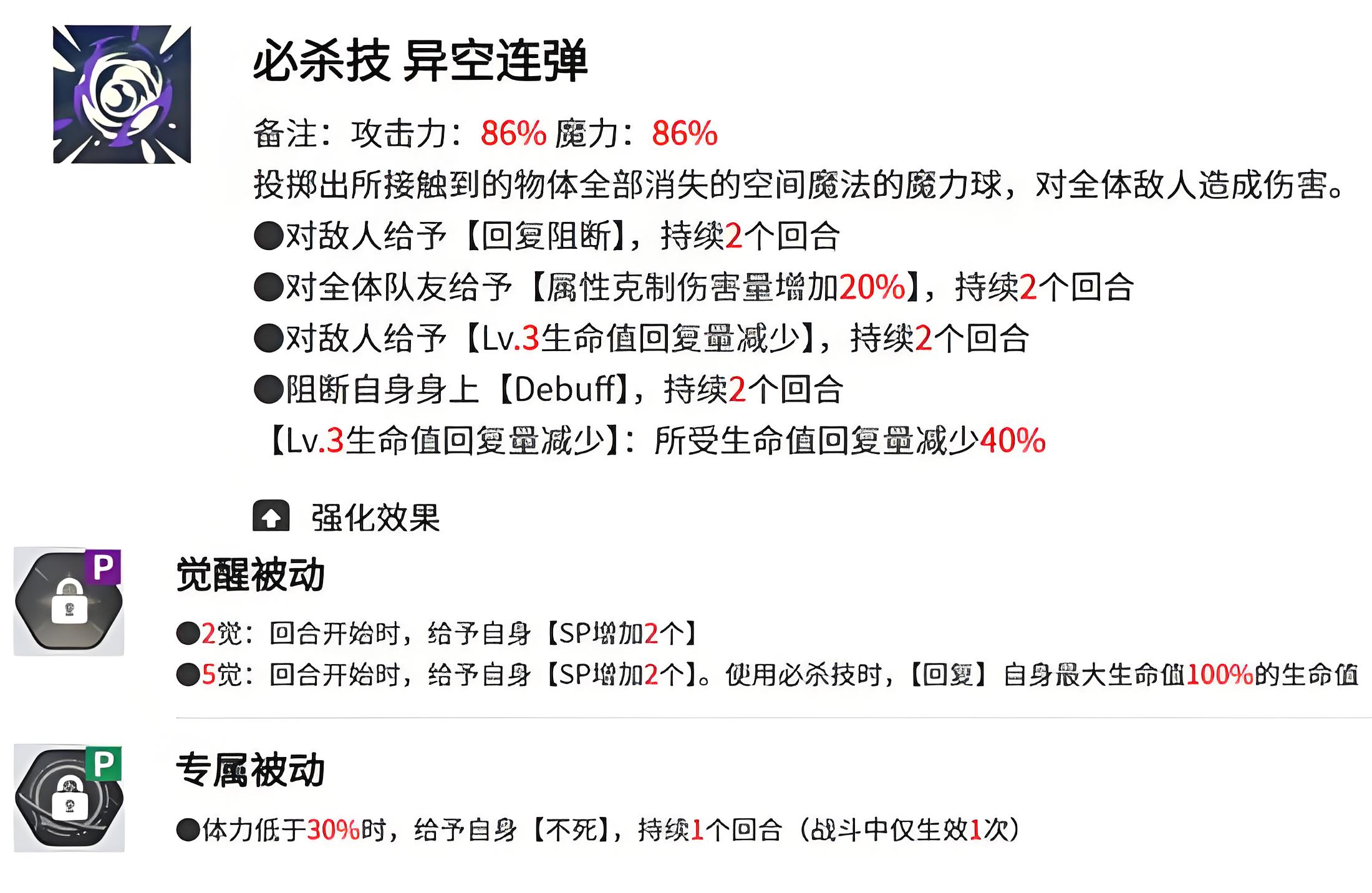 4、必杀技异空连弹有86%攻击力魔力倍率,施加回复阻断等负面,给队友20%属性克制伤害加成,并清自身Debuff。