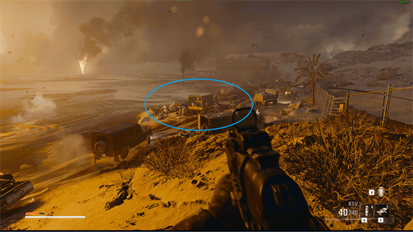 在任务的第二个过场之后,您有机会使用设备轮。选择RC-XD并向右看,那里有多个敌人从卡车里出来。朝那个方向发射RC-XD,瞄准中间的敌人,在三人的射程内引爆。请查看下图以更好地理解。