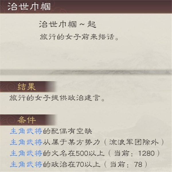 其他老婆多多少少都有剧本对应人物能速通娶回家,这位的娶妻条件只能硬着头皮刷。要求有5座城市的民心全满,如果没有情义帮忙,至少需要砸出去5*5*10*20=5000点行动力。好处是整完这个老婆之后大概你这个档是不需要怕友好信物不够了。