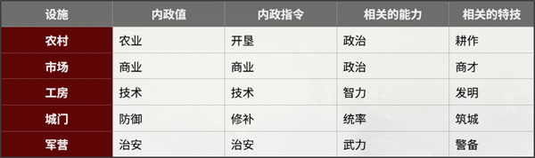 内政命令有开垦、商业、技术、修补与治安五种,分别可在农村、市场、工房、城门和军营执行。