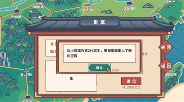 1、先在【卧室】退位然后将自己的儿子立为家主,就可以操控自己的儿子了。