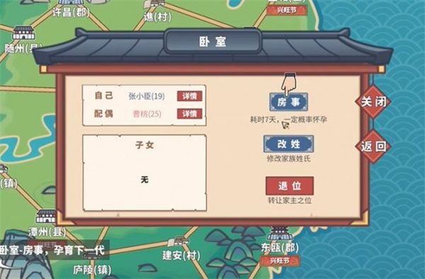 5、生孩子是概率性的,没生出来可以多尝试升级自己的宅邸提升怀孕概率。