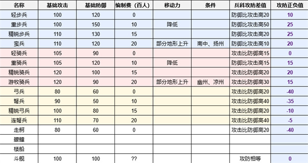 兵科攻防差值(将展现在最终四維園上)是基于兵种国定的,和武将统率、兵力数量无关。