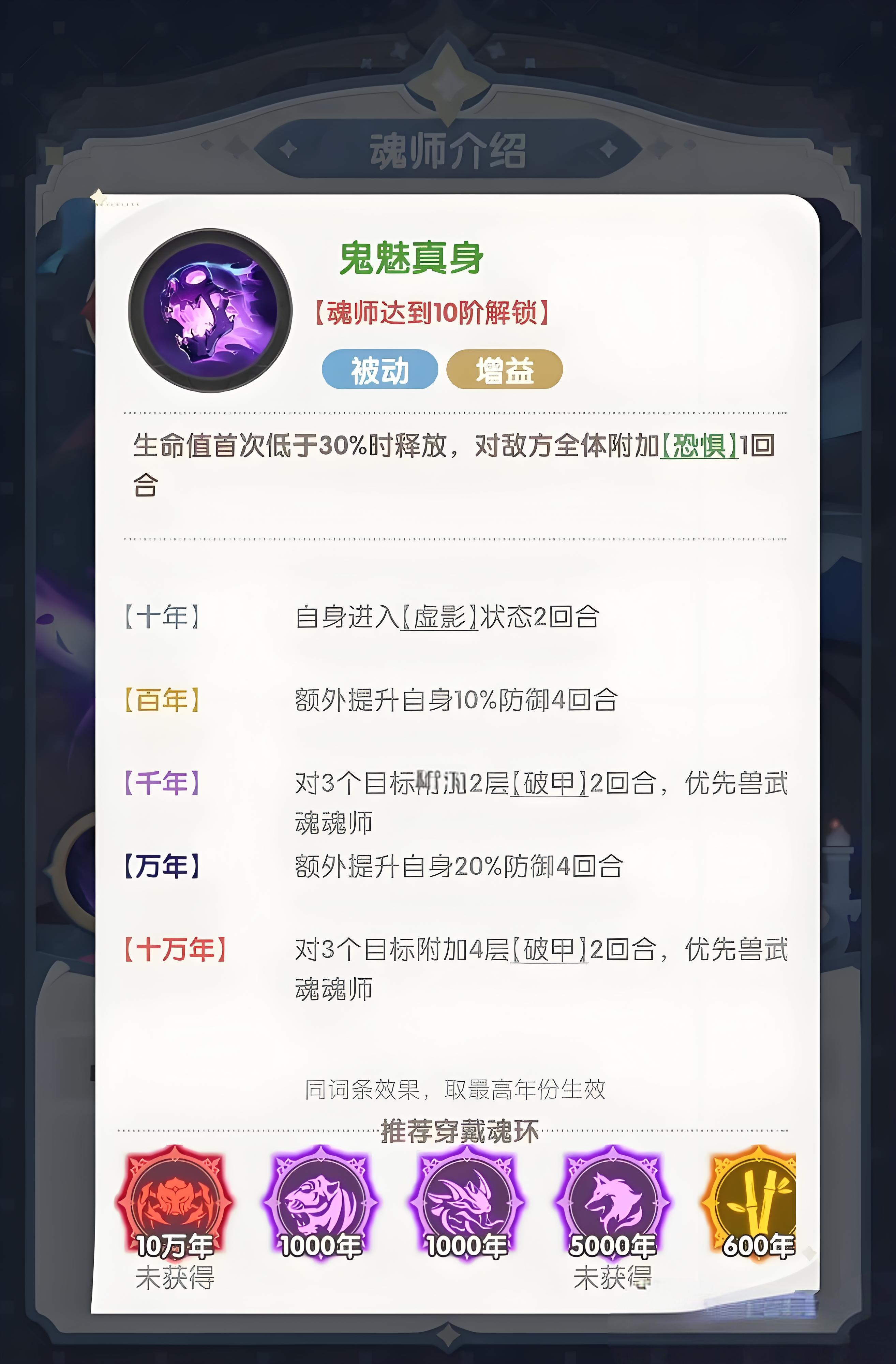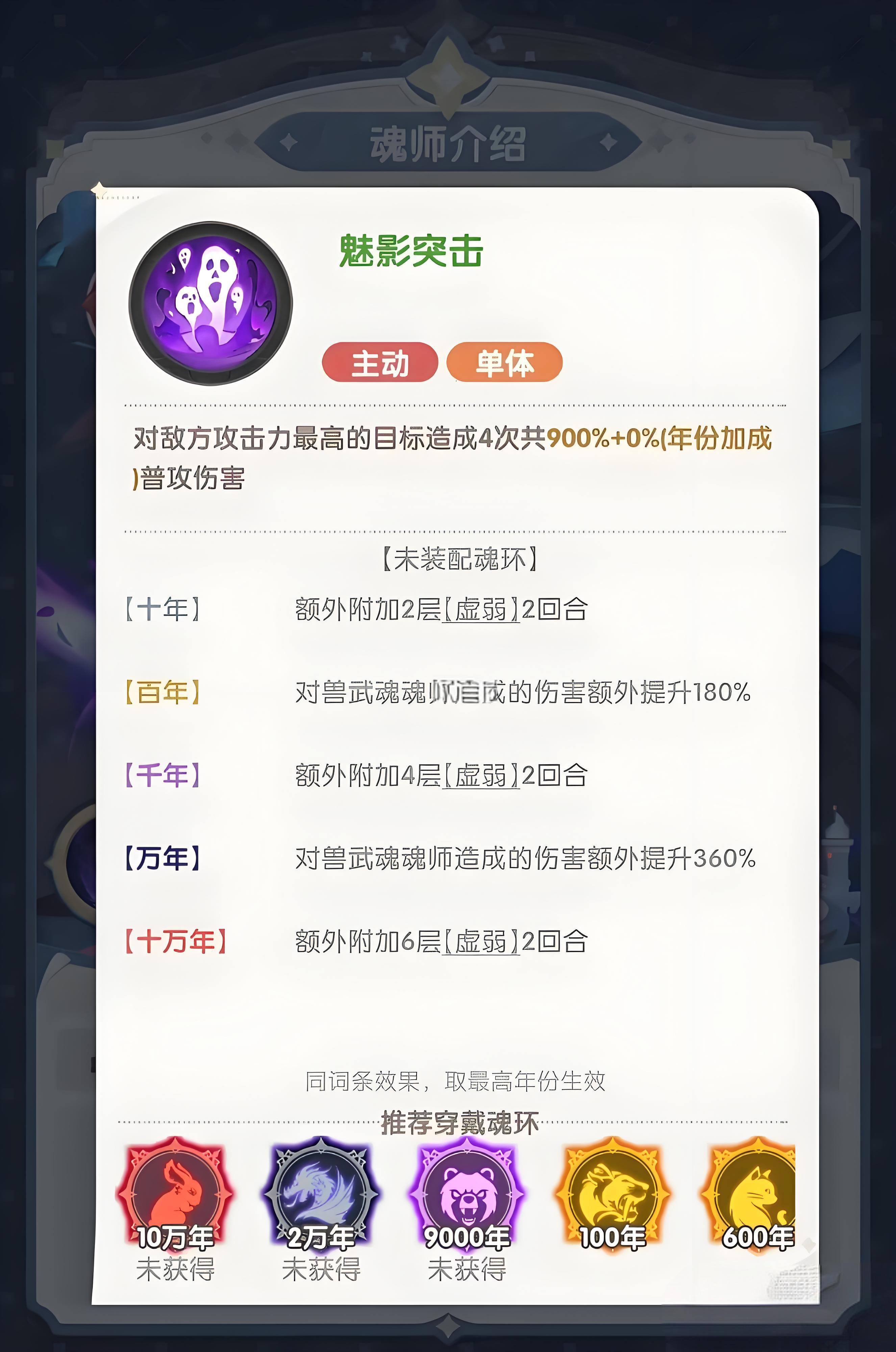 1、主动技能魅影突击锁定敌方攻击力最高目标造成多次伤害,提升魂环年限附加虚弱降攻,对兽武魂魂师额外增伤适配针对性出战。