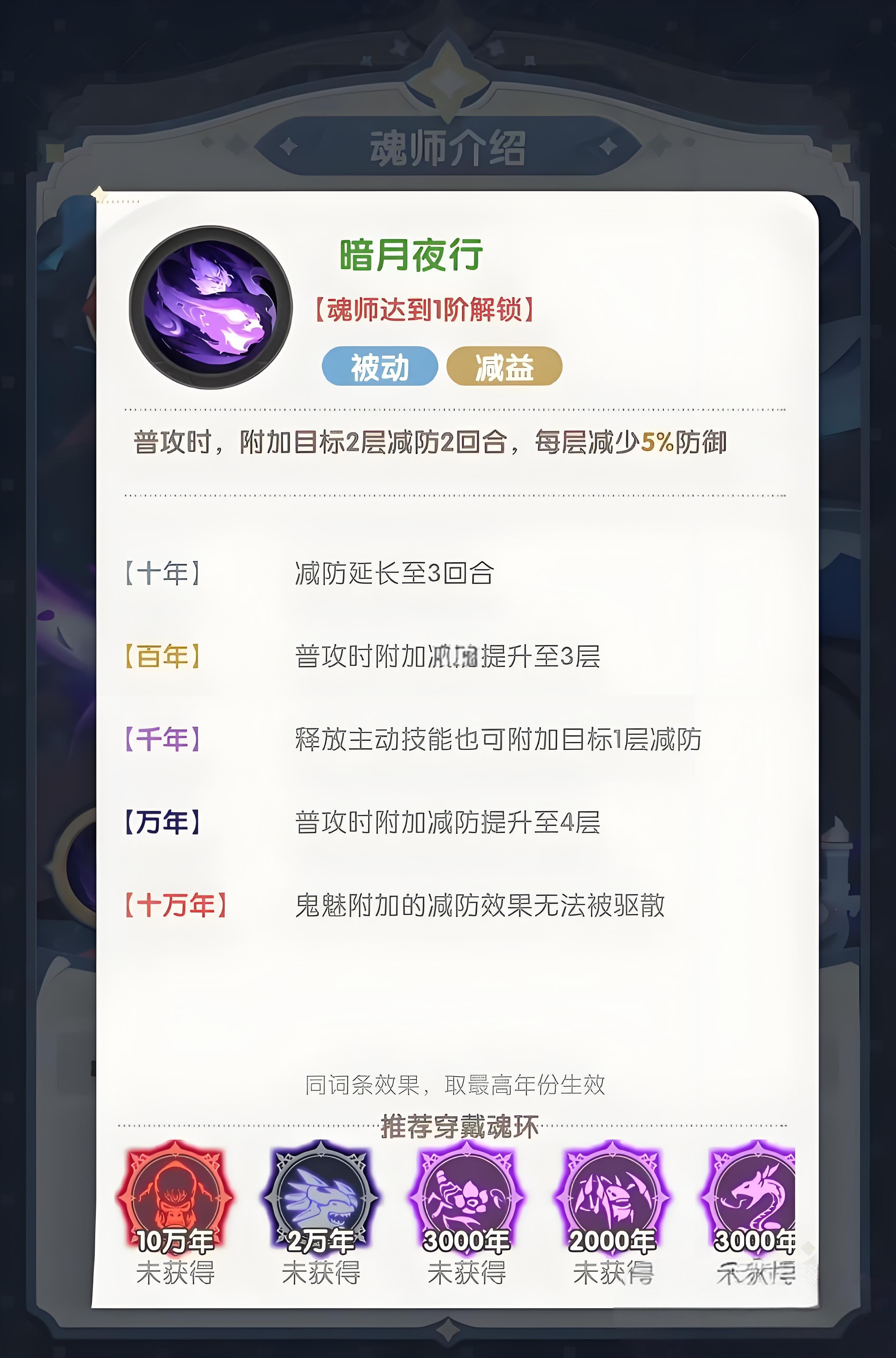 2、被动暗月夜行普攻给目标附加两层减防每层五,魂环提升后主动技能也加减防,最多叠加四层且不可驱散助力队友输出提升。