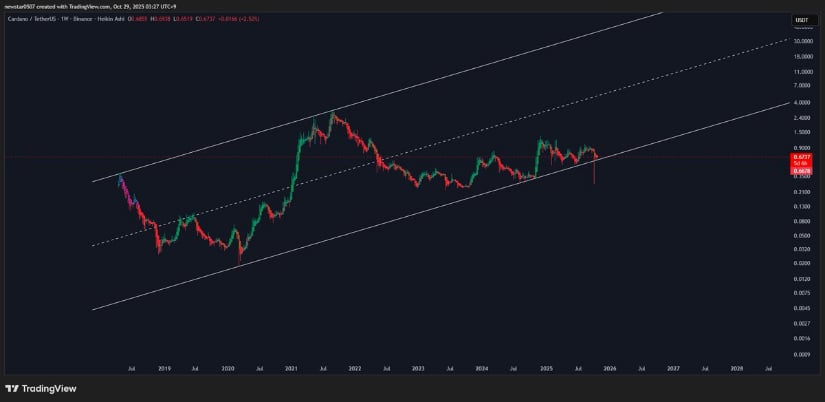 卡尔达诺价格正在测试其长期上升通道下轨,该趋势结构自2023年初以来一直主导价格走势。历史上每次触及通道底部均引发大幅反弹,使得当前测试成为重要转折点。