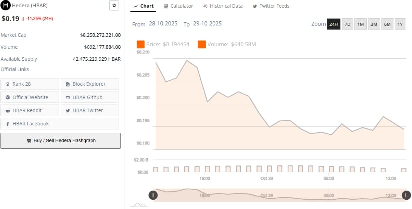 BraveNewCoin数据显示Hedera现报0.19美元,24小时跌幅11.26%。该网络市值82.6亿美元,24小时交易量6.9217亿美元,流通供应量424.7亿枚代币,当前市值排名全球第28位。