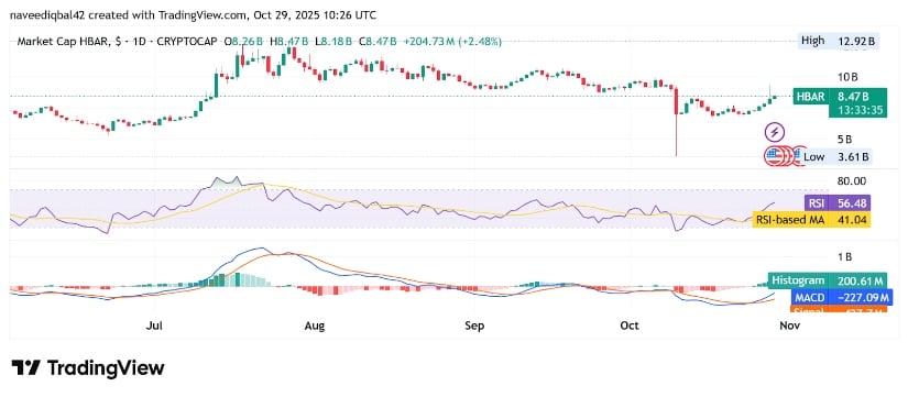 截至撰稿时,TradingView数据显示HBAR市值84.5亿美元,自10月初36.1亿美元低点反弹后单日上涨2.28%。日线图显示在连阳线与放量推动下,市值已稳固回升至80亿美元关口上方,表明买家在长期盘整后正重获主导权。