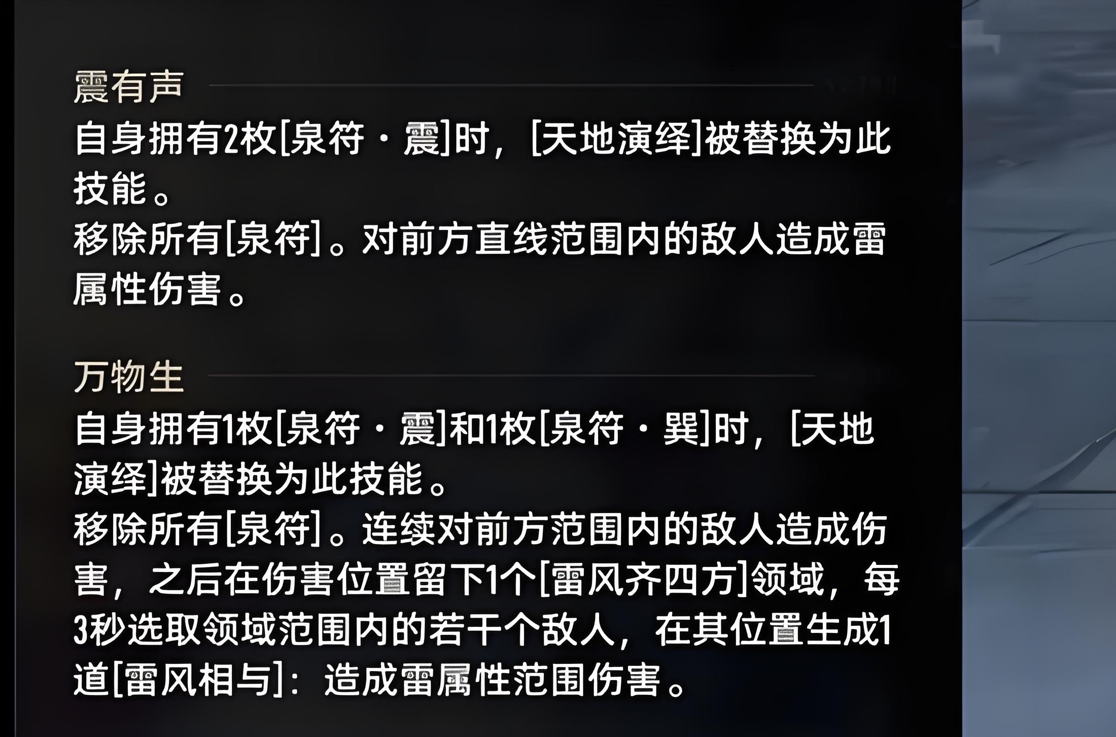 2、解天机点按获全符阵,造成150%雷属性伤害适合单体打击,长按生成全符训给全队24秒增益,双符训触发天地鸣提全队30%技能伤。
