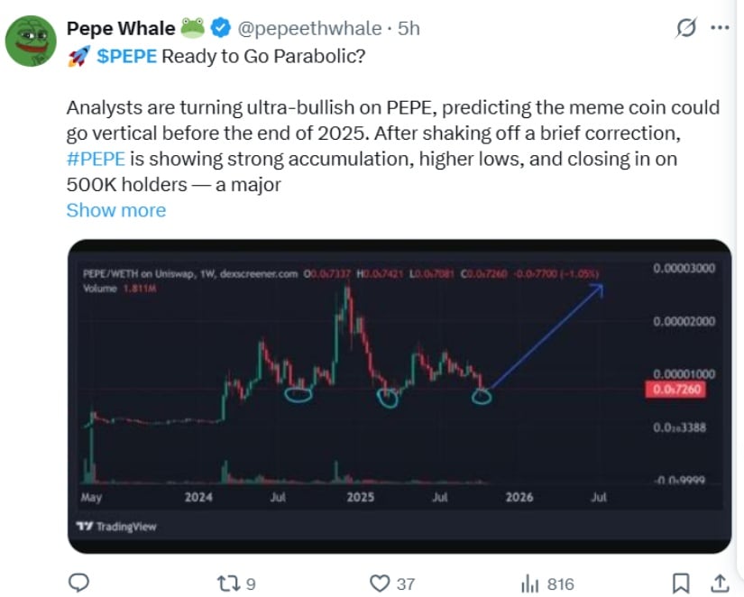 分析师对PEPE越发看好,指出强劲的吸筹态势、持续增长的持币地址数以及有利的市场动能,都预示着2025年底前可能出现爆发性上涨。来源:X平台@PepeWhale