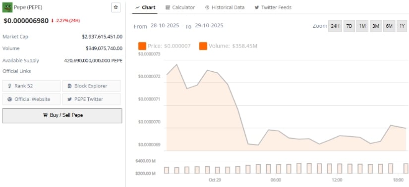 截至发稿时,佩佩币报价0.000006980美元,24小时下跌2.27%。来源:Brave New Coin