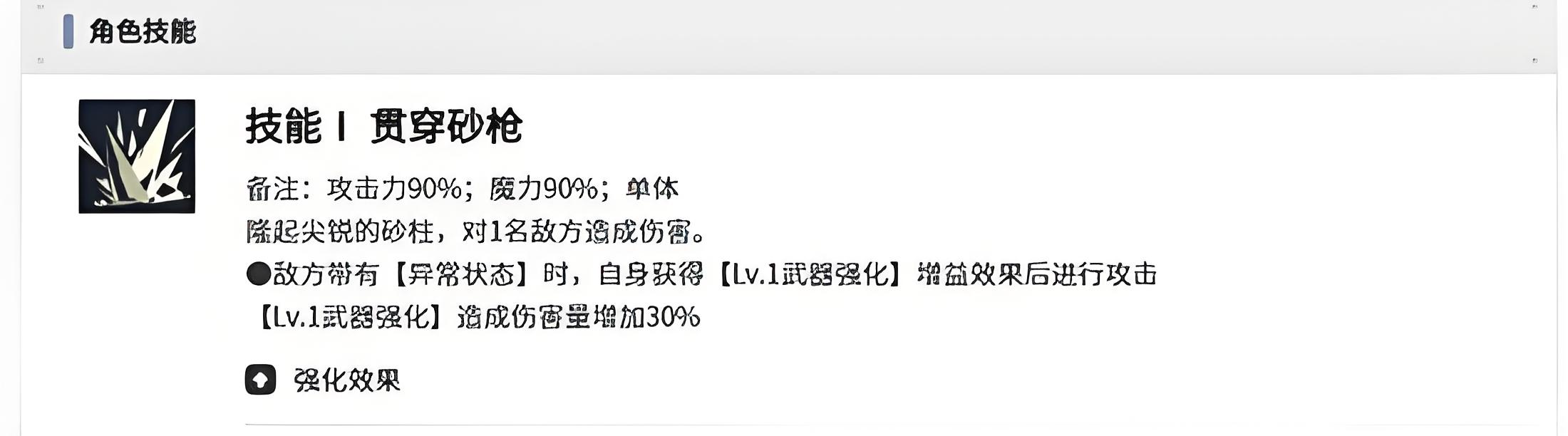 1、核心技能贯穿砂枪是单体输出技能,基础攻击力和魔力值加成均为90%,召唤尖锐沙柱造成伤害,敌方异常时获武器强化提后续30%攻击伤害。