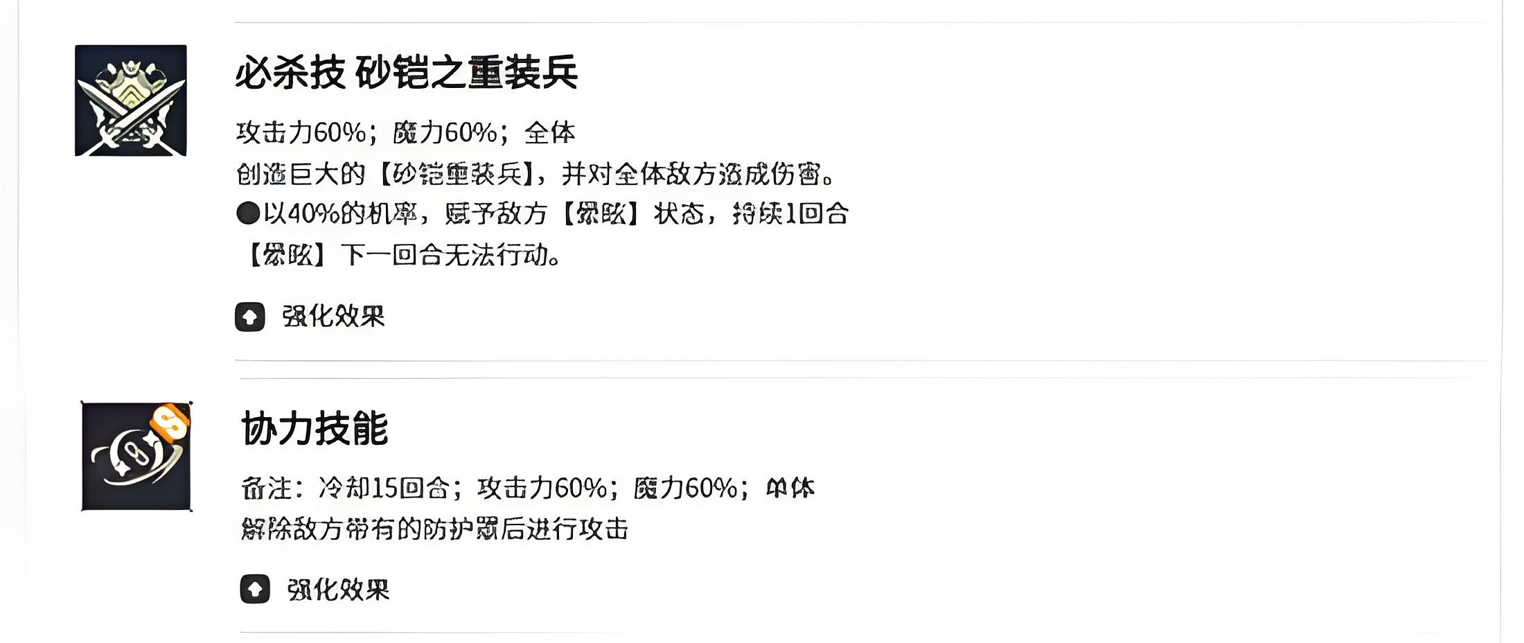 3、必杀技砂铠之重装兵攻魔加成60%,覆盖全体敌人召唤重装兵造范围伤害,40%概率附晕眩,复数敌人场景清理小怪打乱阵型更优。