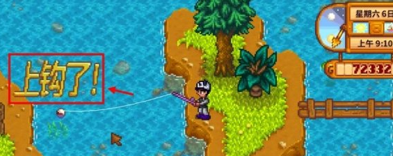 2、玩家拿出鱼竿后点击开始钓鱼,出现“上钩了”提示时再点击鼠标右键进行拉线;