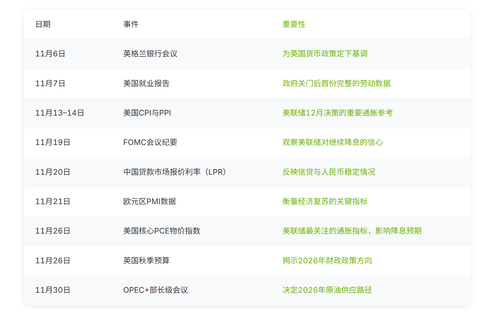 对传统金融市场来说,11月是一场“现实考验”。各国正试探宽松政策的边界,看看能否在不重新推高通胀的情况下继续降息。能源价格在剧烈波动后趋于平稳,而英国等主要经济体即将公布的财政计划,也将揭示各国如何在迈向2026年的过程中,在经济增长和财政纪律之间找到平衡。