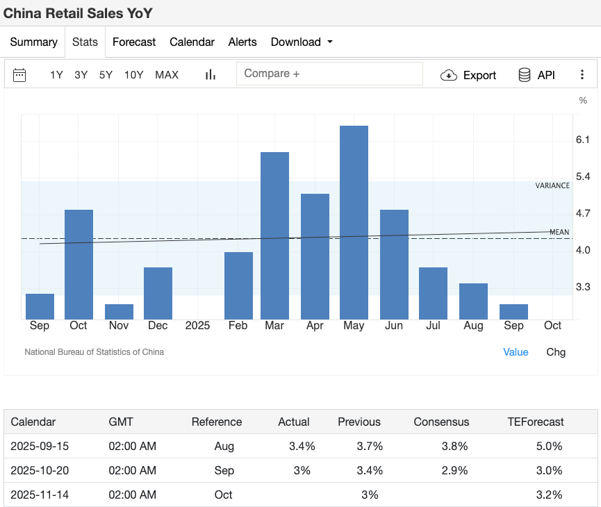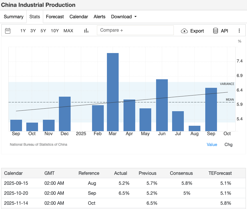 零售销售、工业产出和固定资产投资等数据将反映近期刺激政策是否开始见效。若表现强劲,将有助于提振区域市场信心及大宗商品价格。