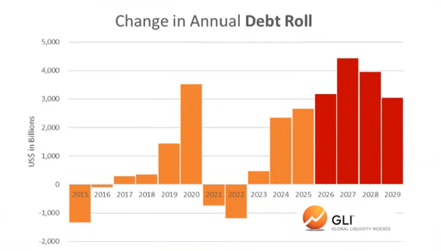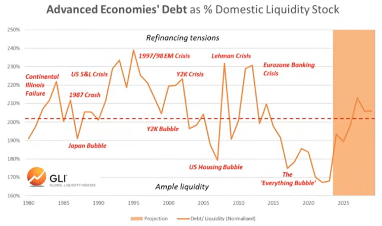 根据全球流动性指数,主要经济体的债务与流动性比率在去年底达到了自 1980 年以来的最低水準。它现在正在上升,预计将持续走高至 2026 年。