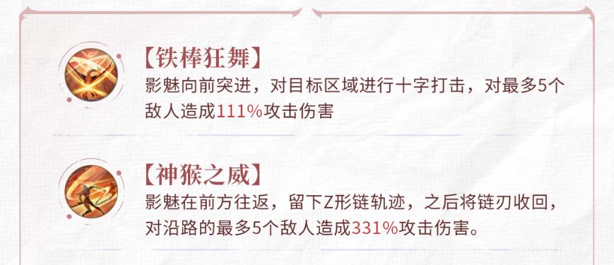 1、铁棒狂舞技能启动后向前迅猛突进,针对目标区域施展密集十字打击,最多可对5个敌人造成111%攻击伤害。