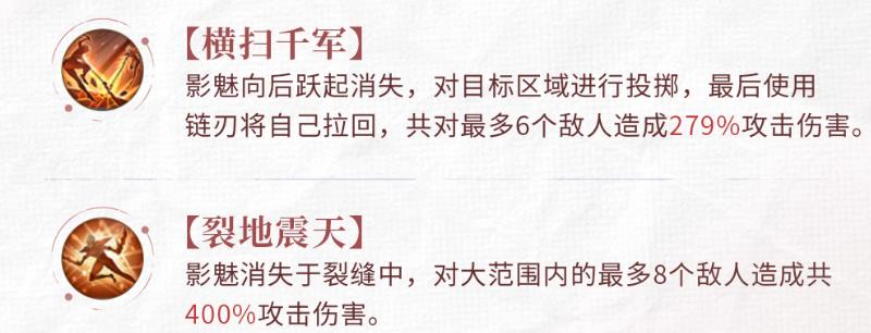 3、横扫千军需向后跃起暂时隐匿身形,向目标区域投掷攻击后,借链刃拉回自身,共对最多6个敌人造成279%攻击伤害。