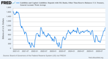 当国会预算僵局迫近、关门风险上升时,财政部会提前发债筹资、拉高 TGA 余额,确保政府停摆期间仍有现金支付必需支出。