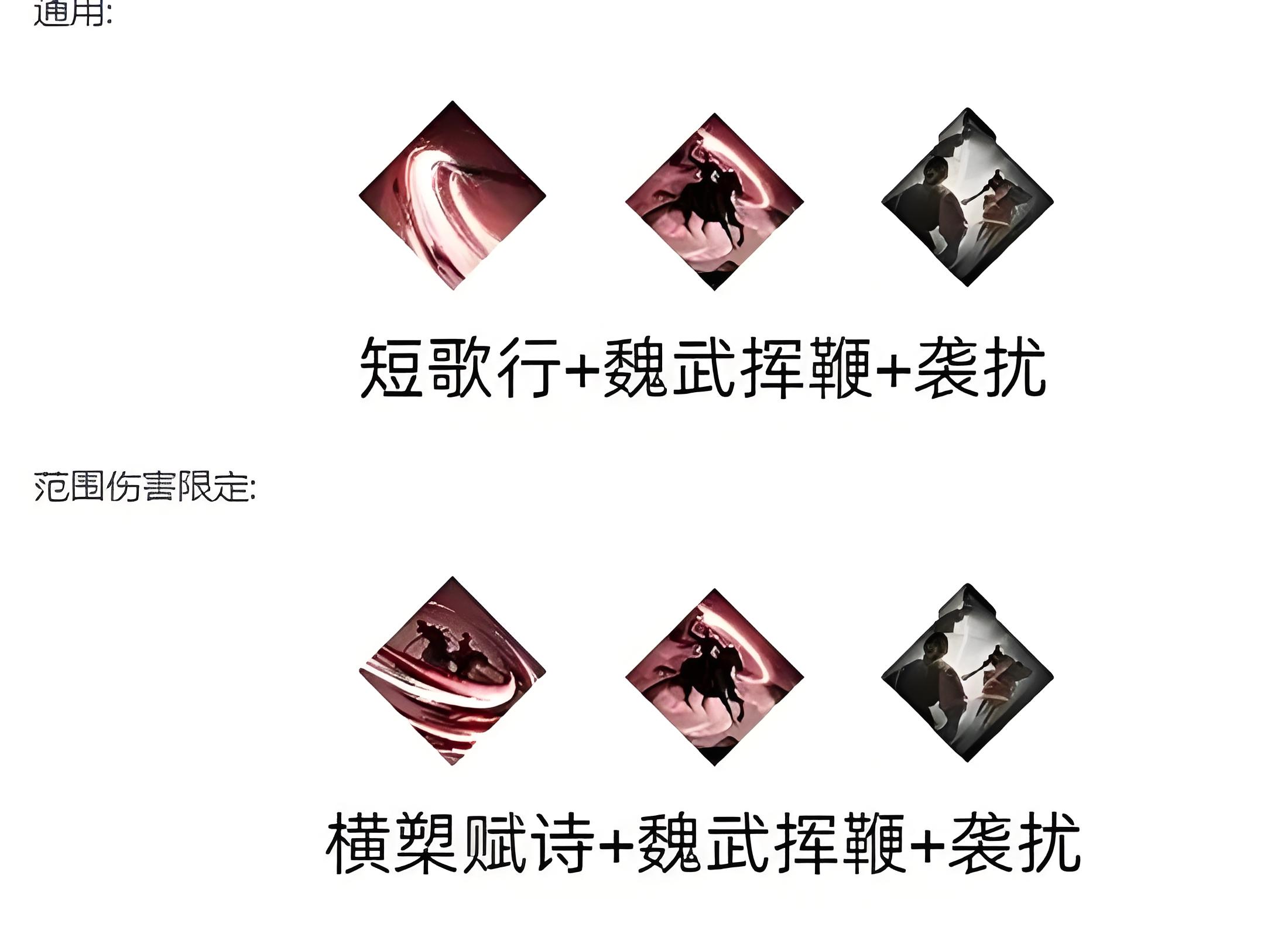 3、曹操推荐短歌行和魏武挥鞭,短歌行补充伤害还能回复战意兼顾续航,魏武挥鞭提供关键增伤buff强化队伍输出。