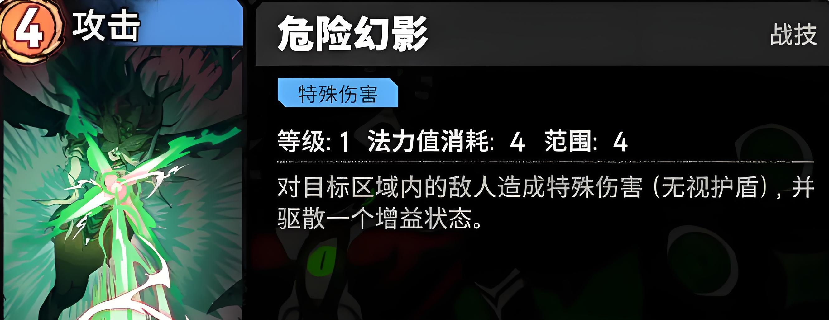 2、战技二危险幻影耗法力有范围,无视护盾伤驱增益,兼具输出辅助能力,适合清场打高护盾目标。
